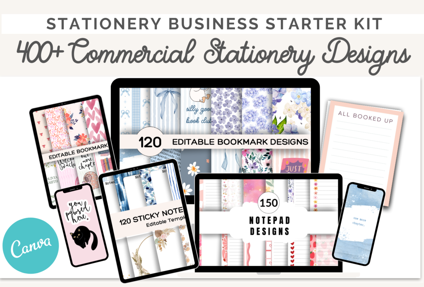 All Editable Commercial Use Canva Templates 150 Notepad Designs 120 Sticky Note Designs 120 Bookmark Designs 40 Greeting Card Designs