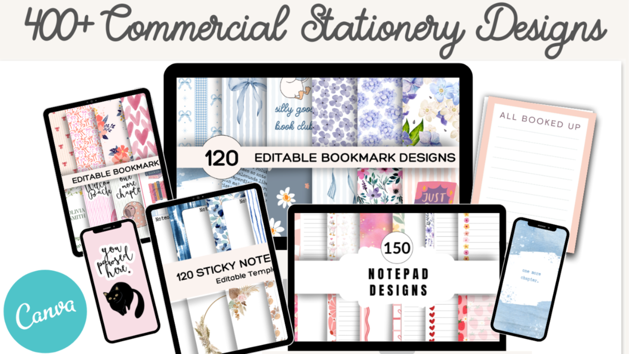 All Editable Commercial Use Canva Templates 150 Notepad Designs 120 Sticky Note Designs 120 Bookmark Designs 40 Greeting Card Designs