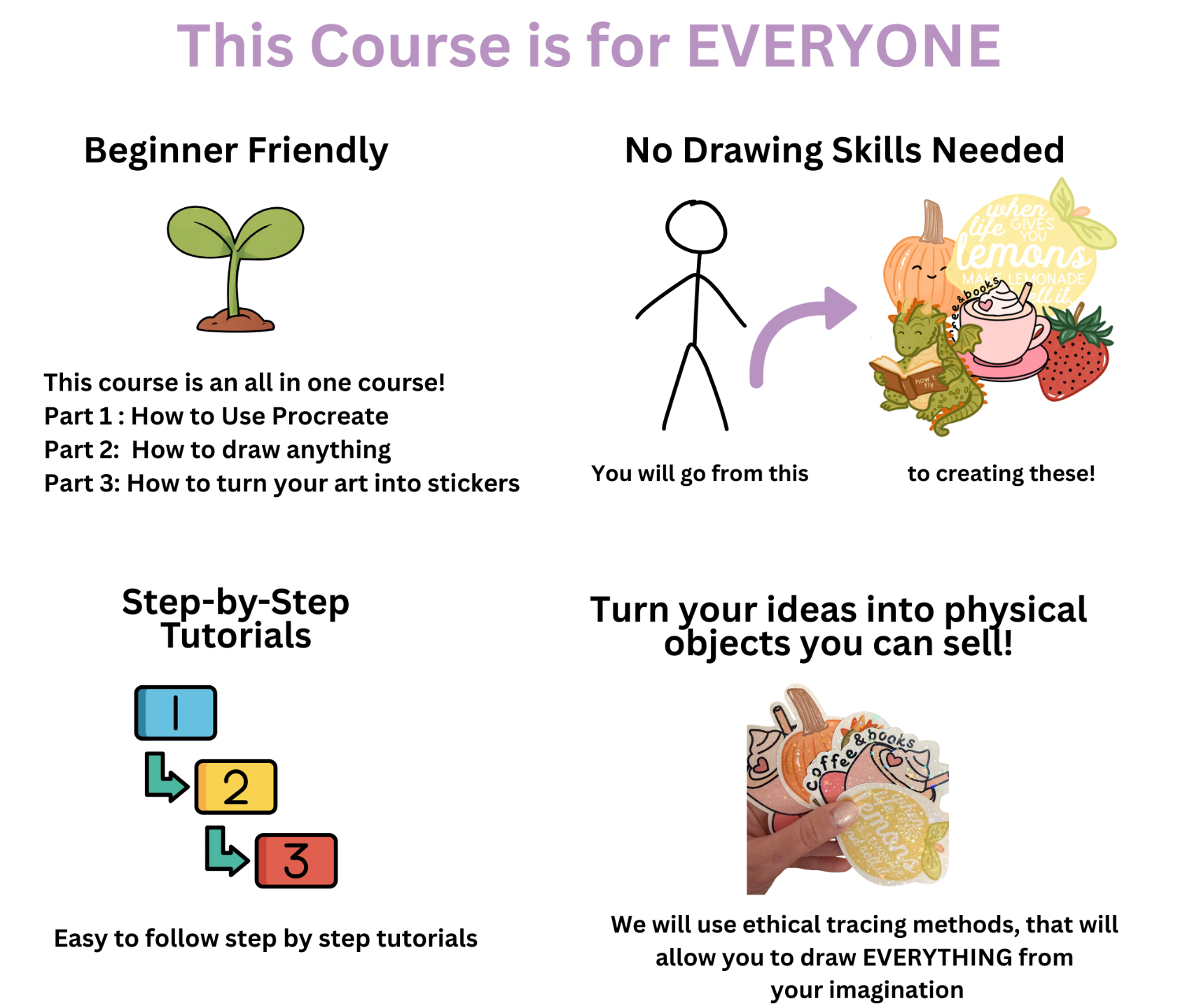 Go from "I can't even draw a stick figure" to creating complicated and beautiful illustrations and creating your own sticker designs in just a few hours! (You can even sell these as digital files!)
