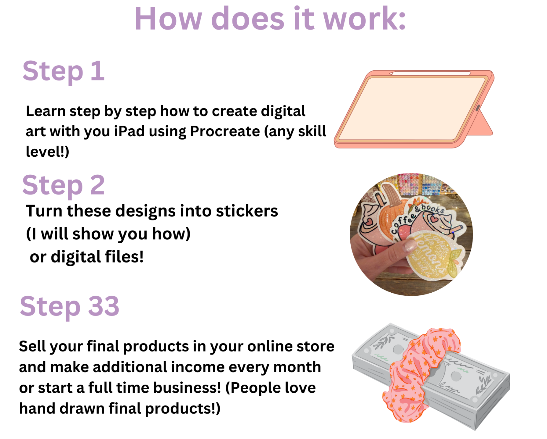 • You are making extra income with your art (you will learn how to make stickers, but you can also sell these designs!)